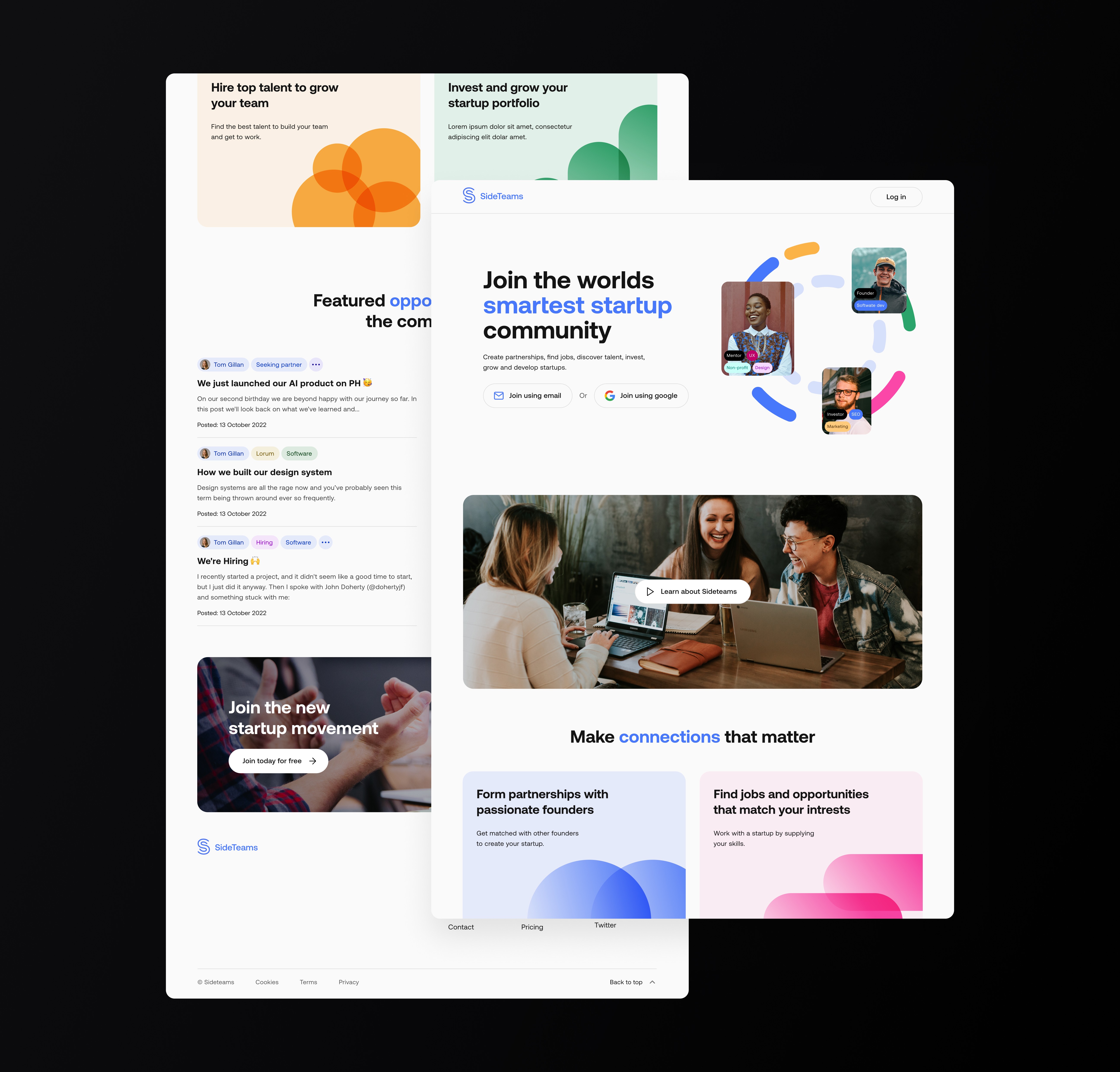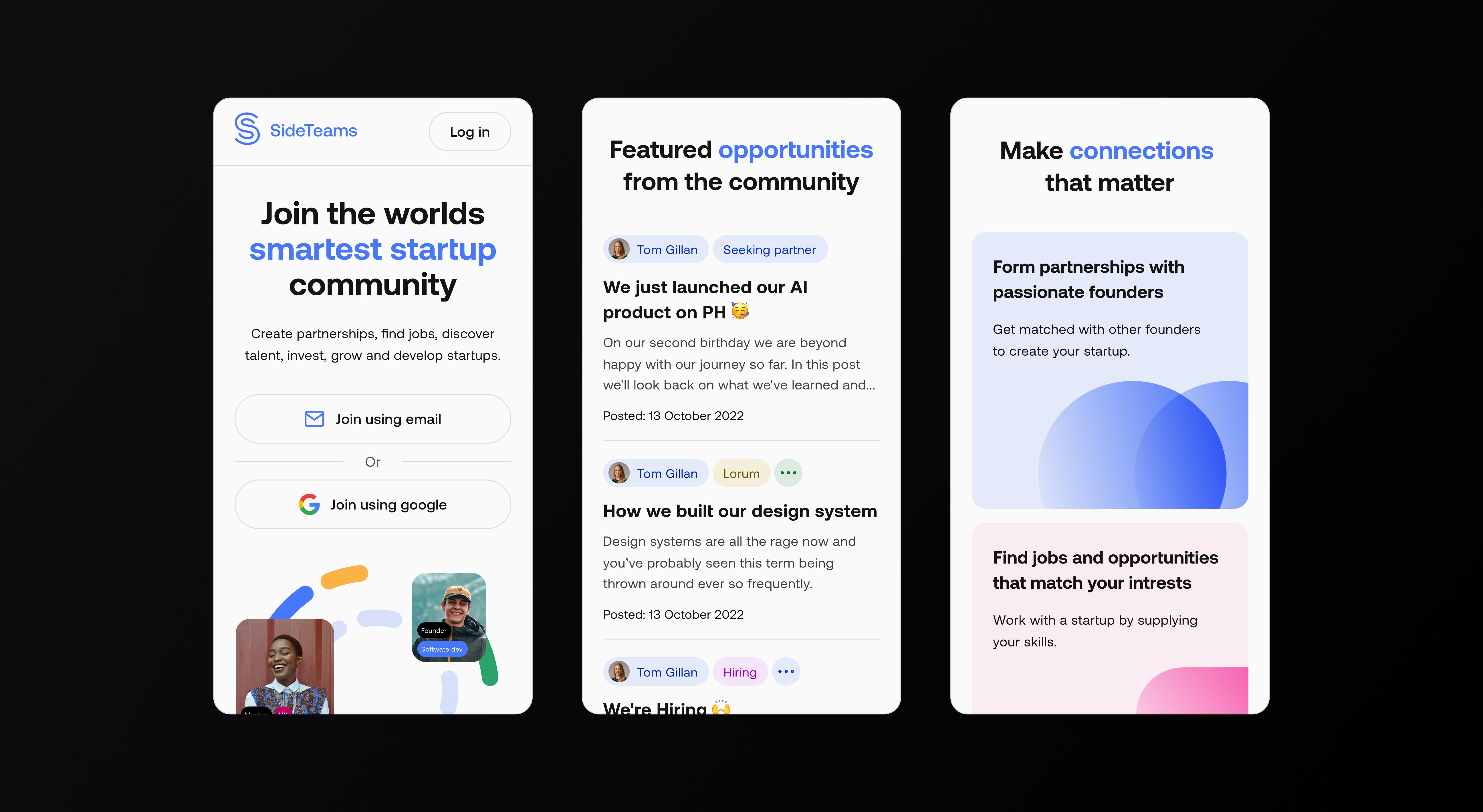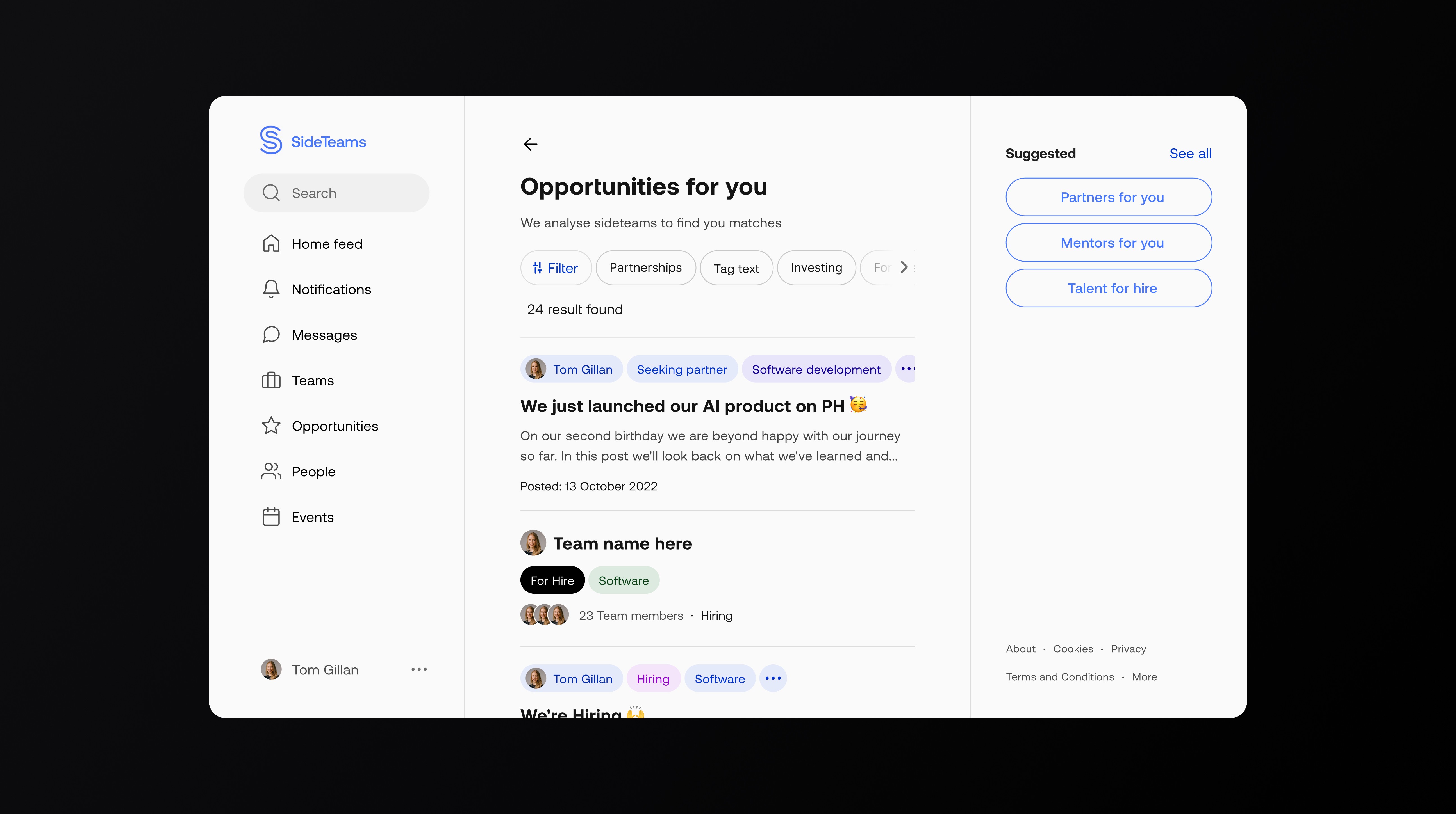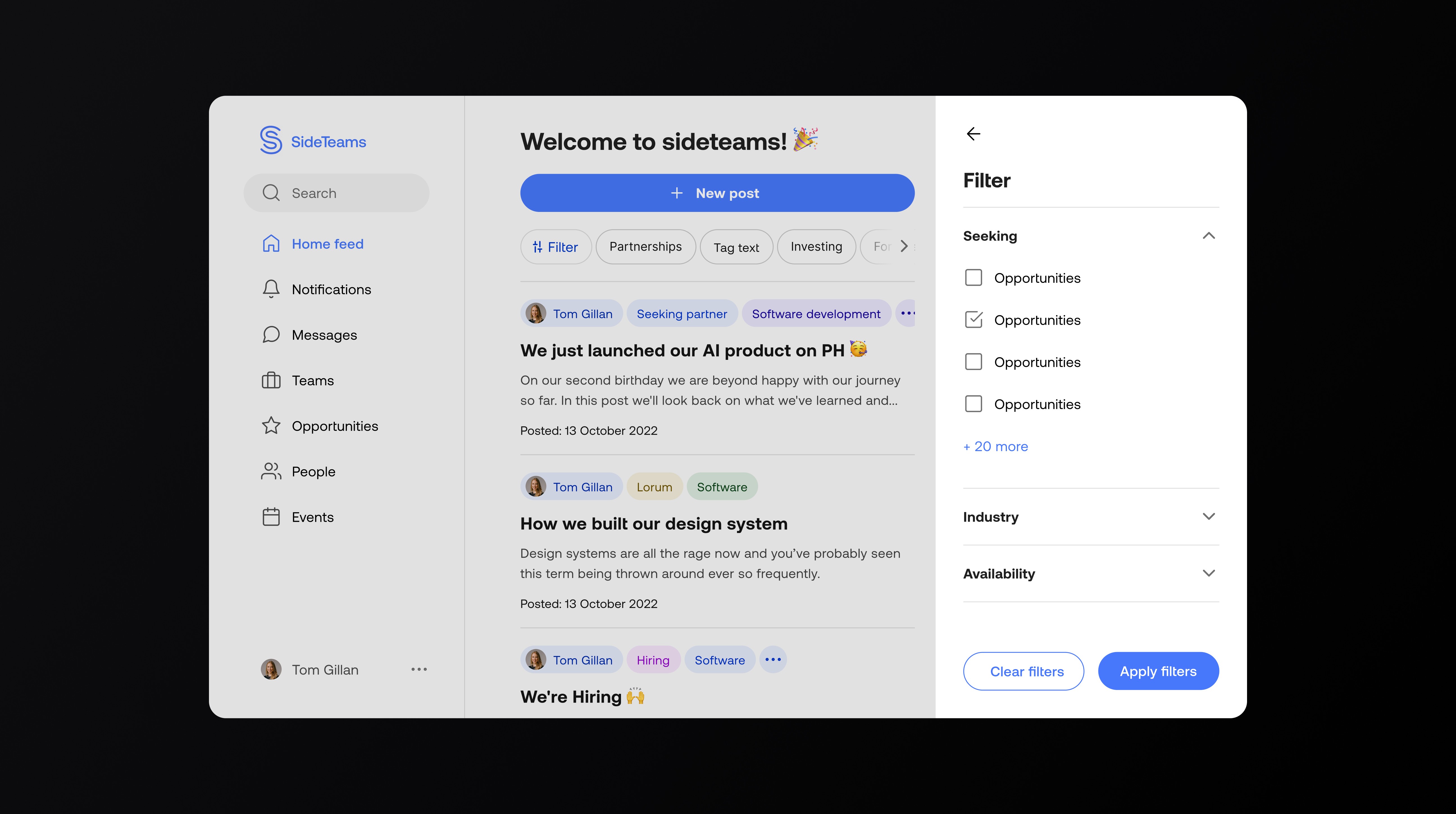 Sideteams connects founders, operators, and investors to form teams, find roles, and share opportunities. I led UX and UI across onboarding, browse, people/teams directories, content, and profile flows—turning insights from analytics and session recordings into a simpler information architecture and a cleaner, more scannable interface.