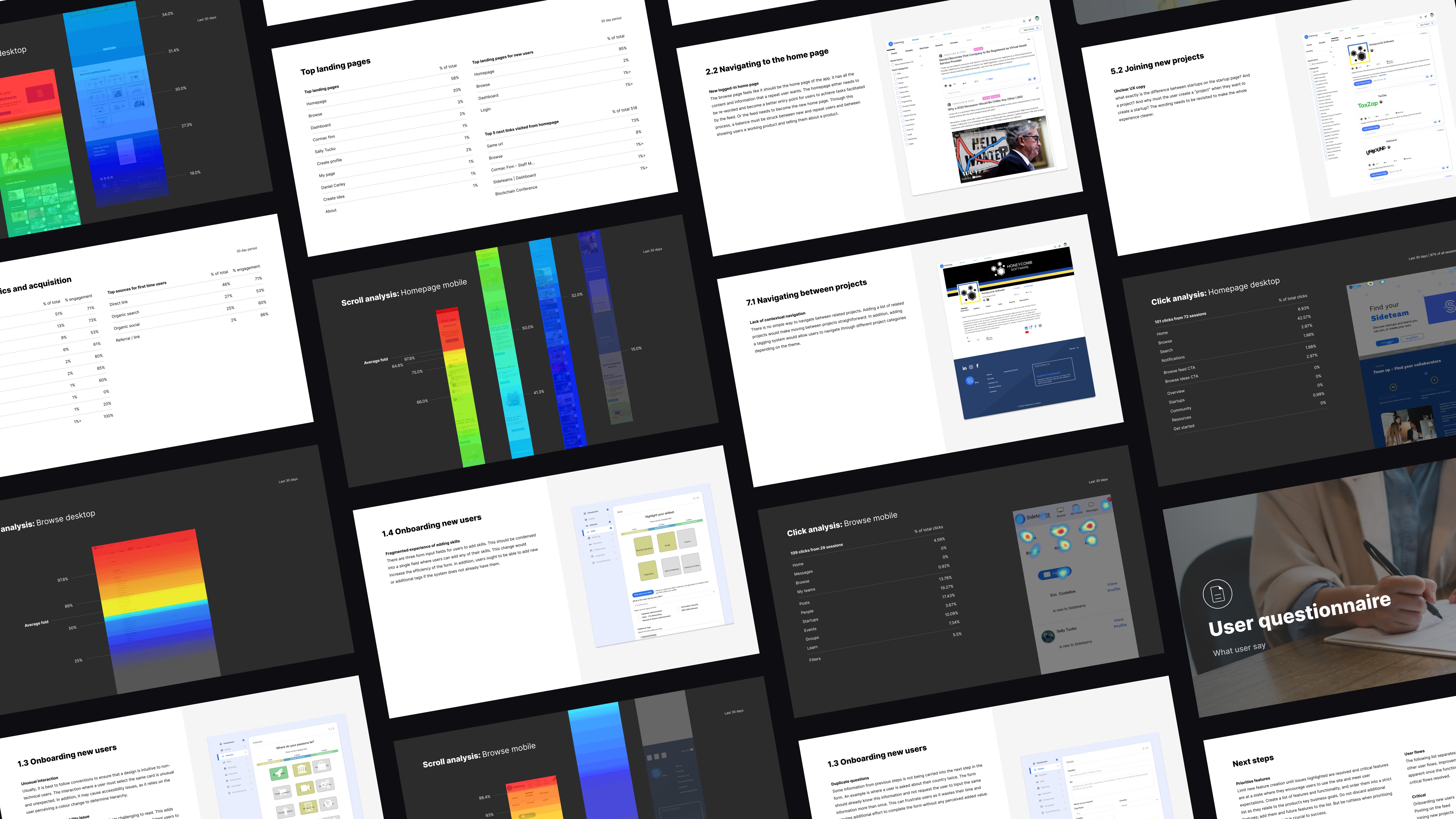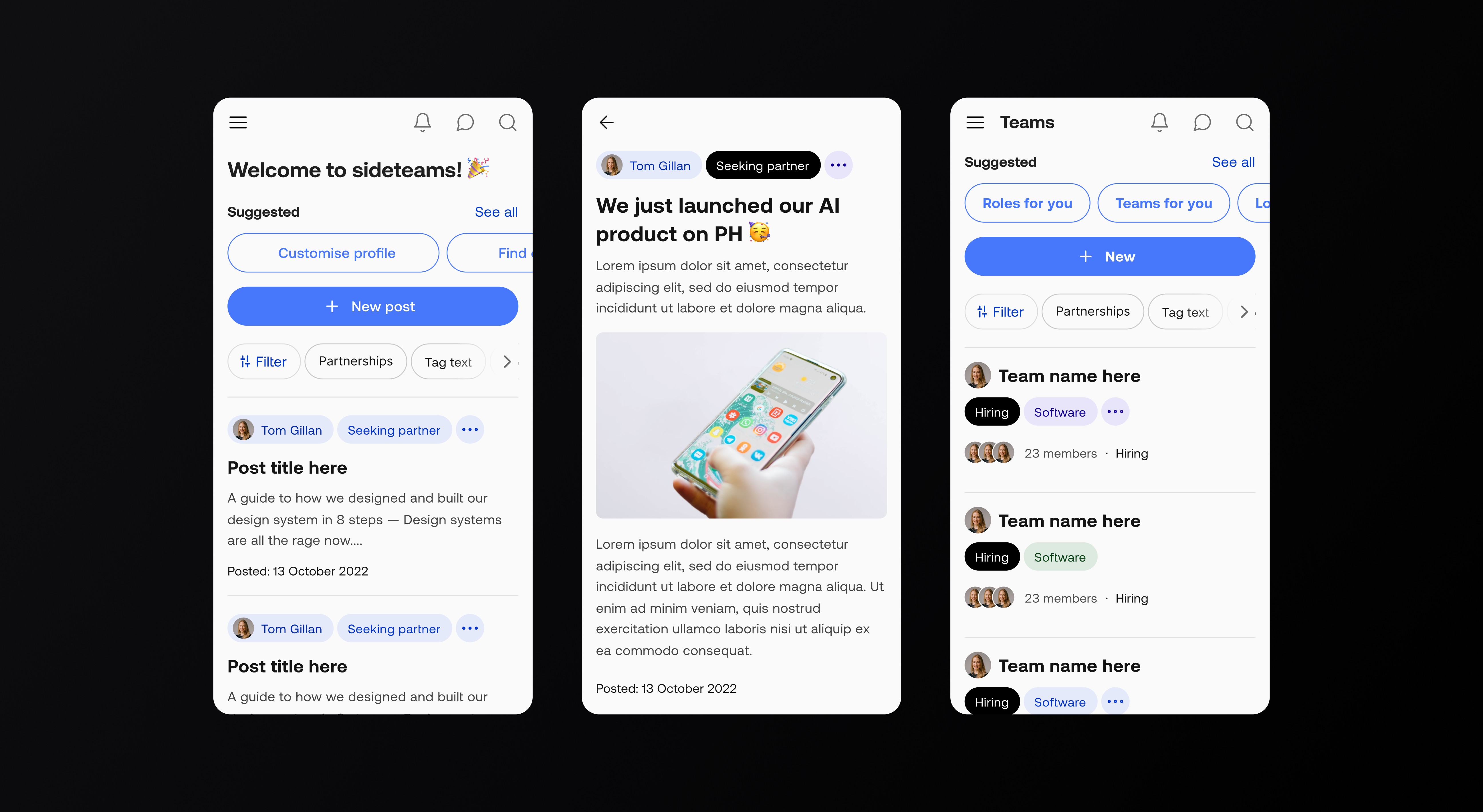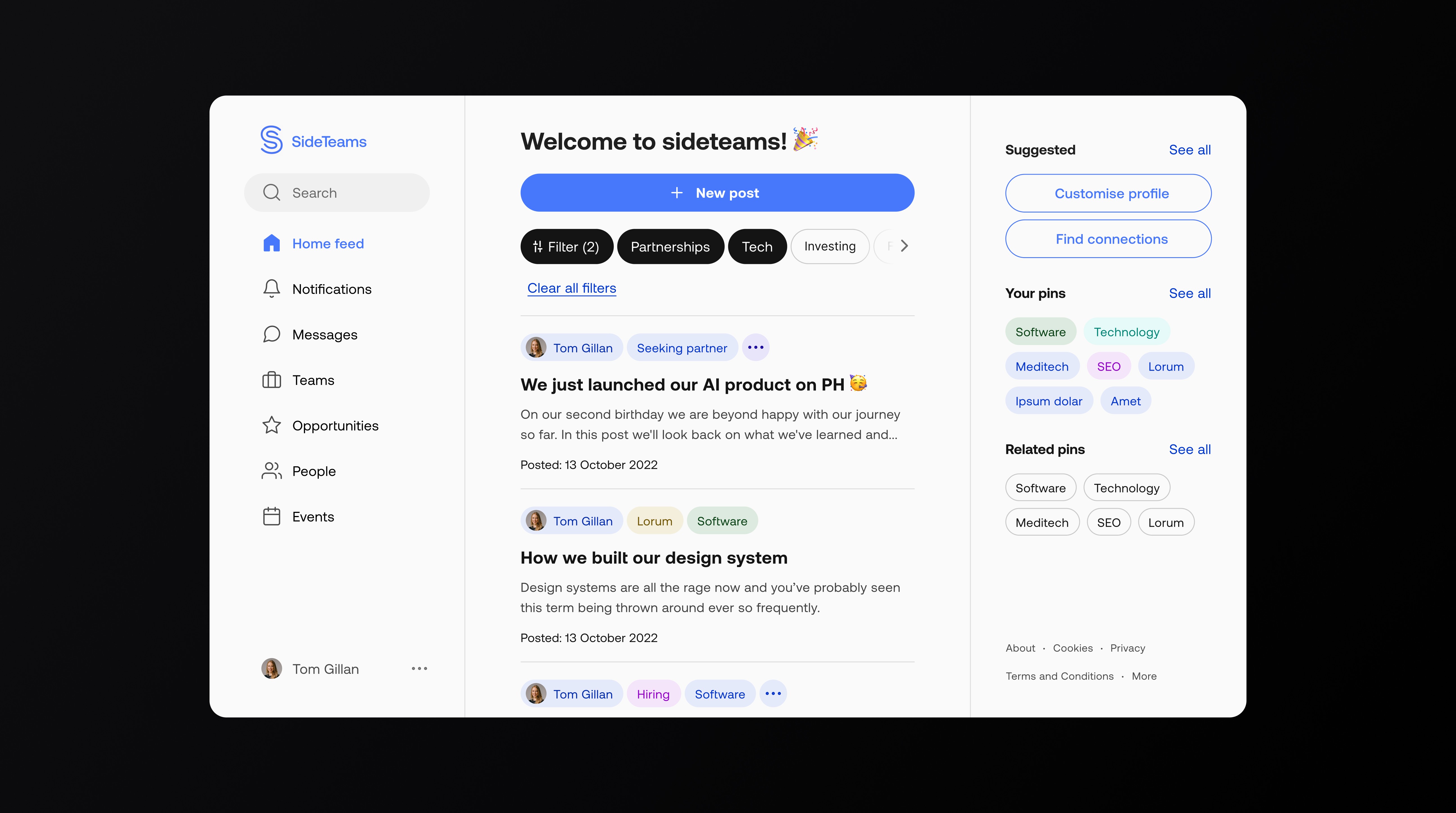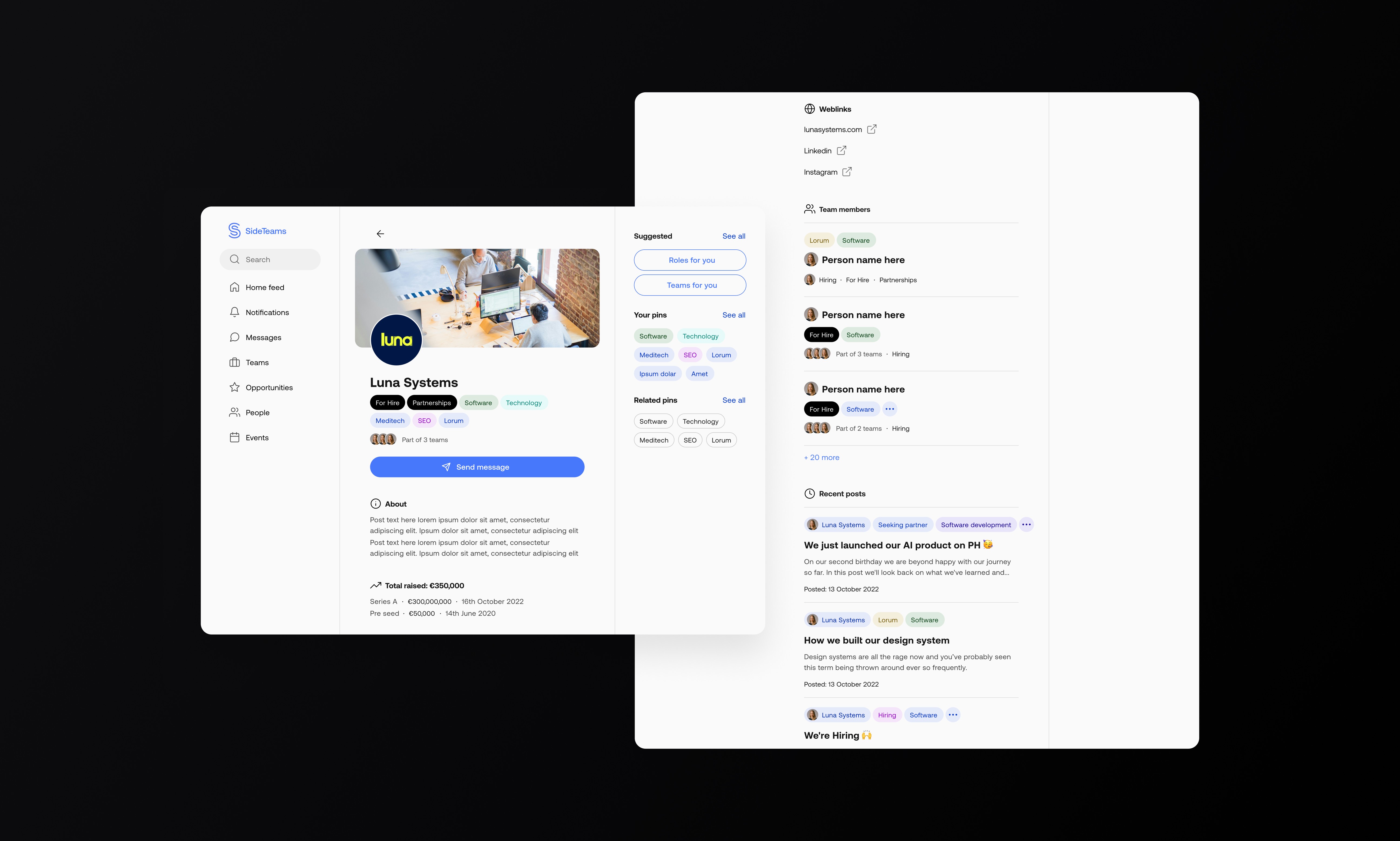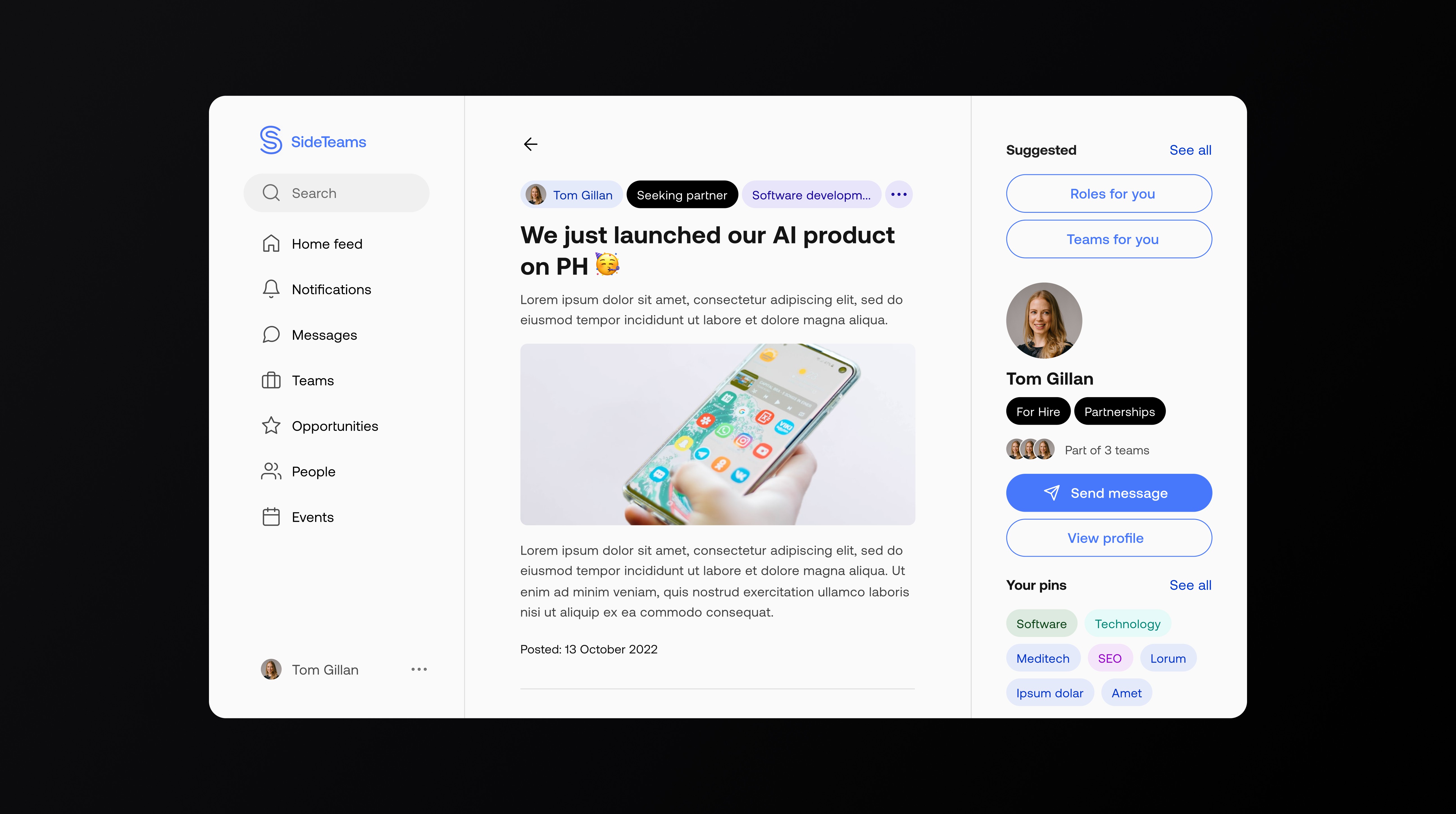 Sideteams connects founders, operators, and investors to form teams, find roles, and share opportunities. I led UX and UI across onboarding, browse, people/teams directories, content, and profile flows—turning insights from analytics and session recordings into a simpler information architecture and a cleaner, more scannable interface.
