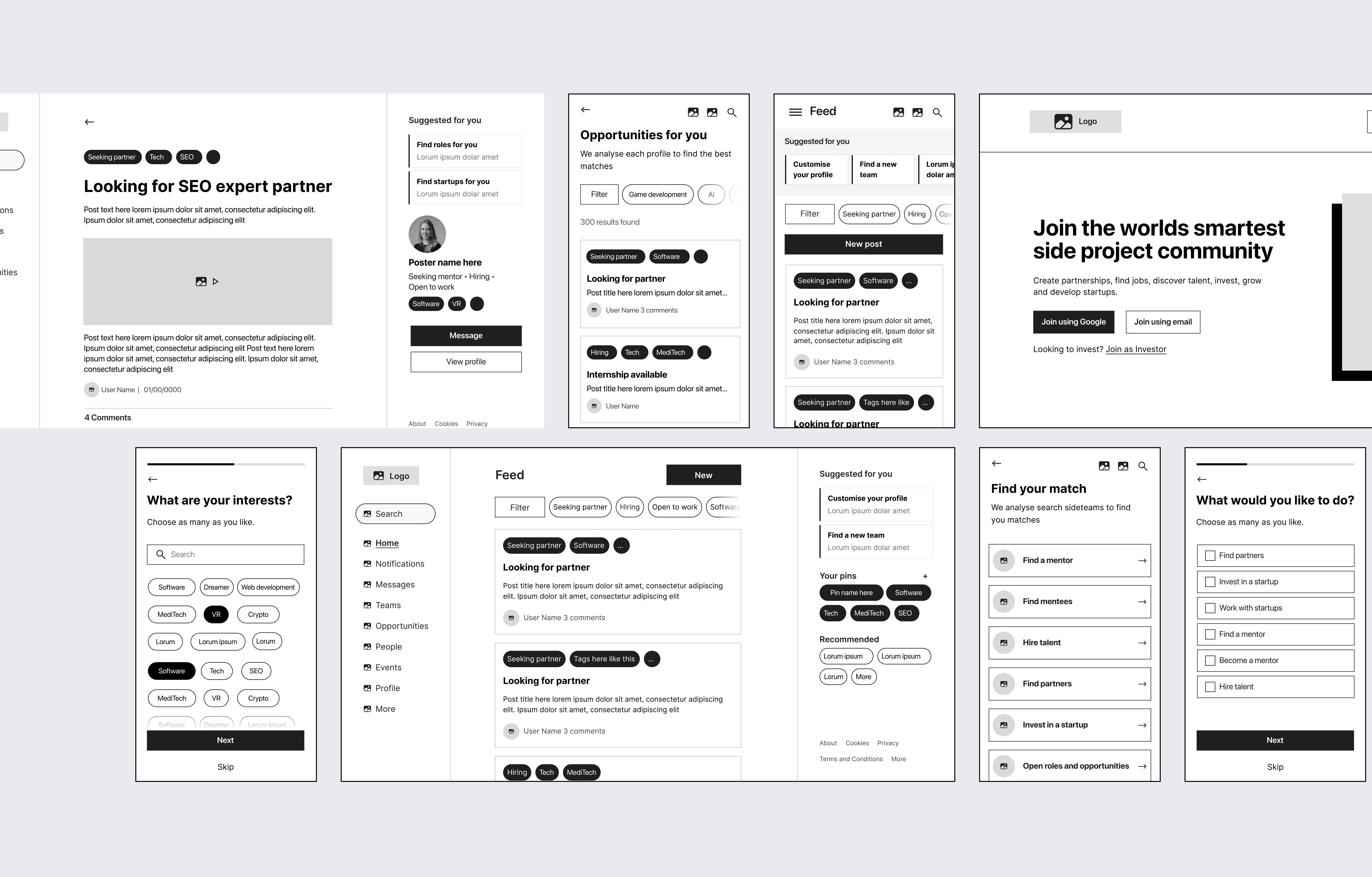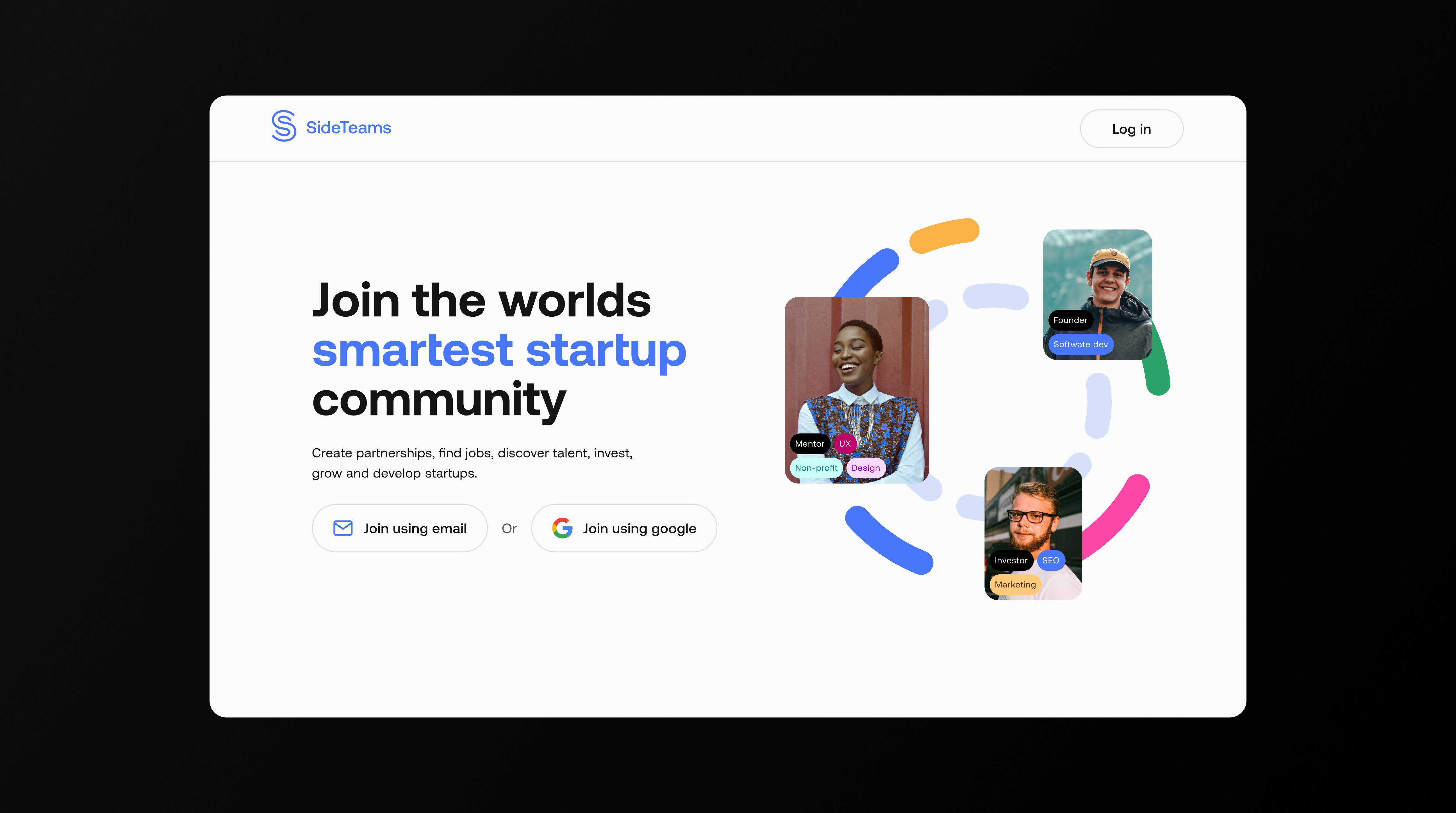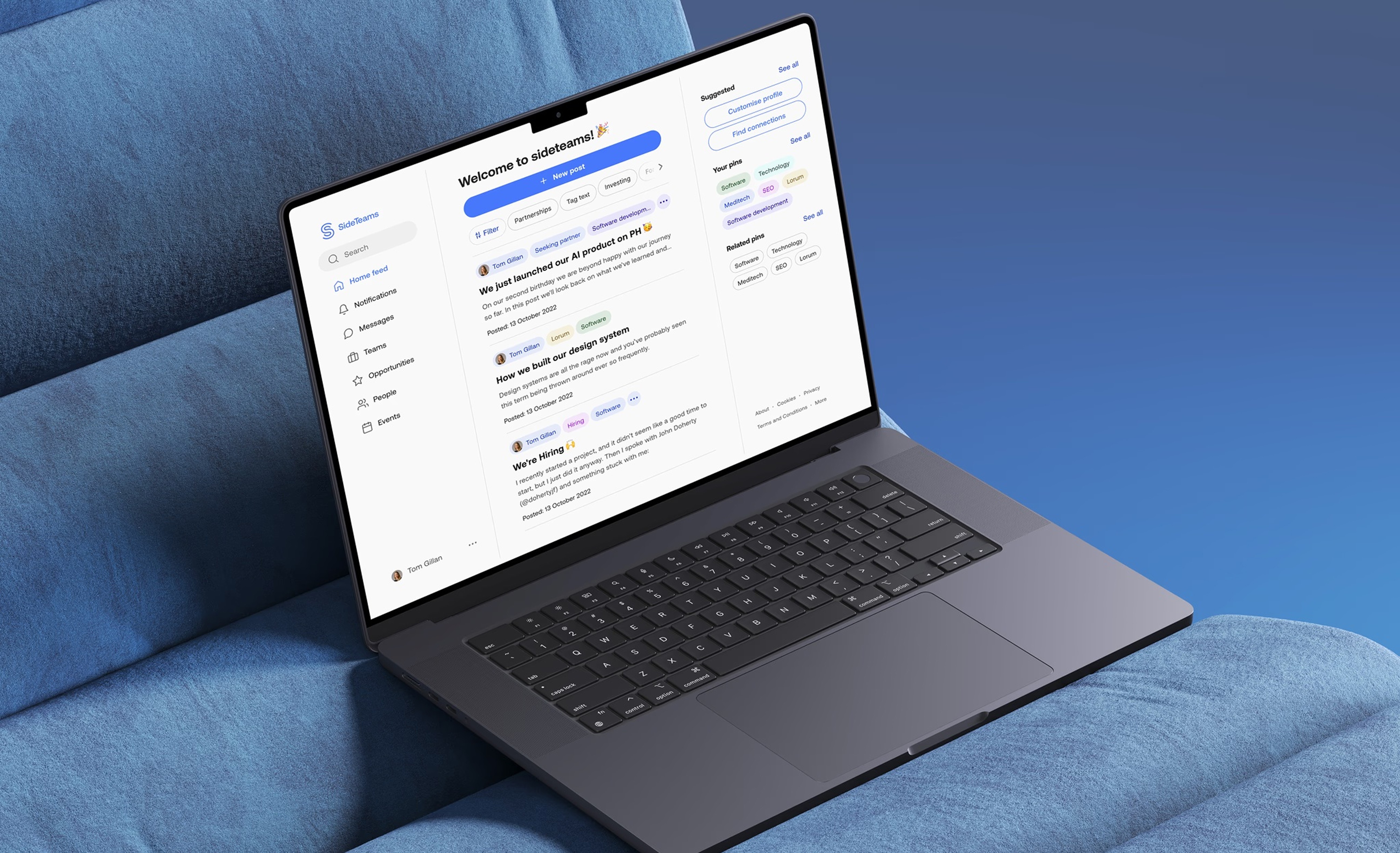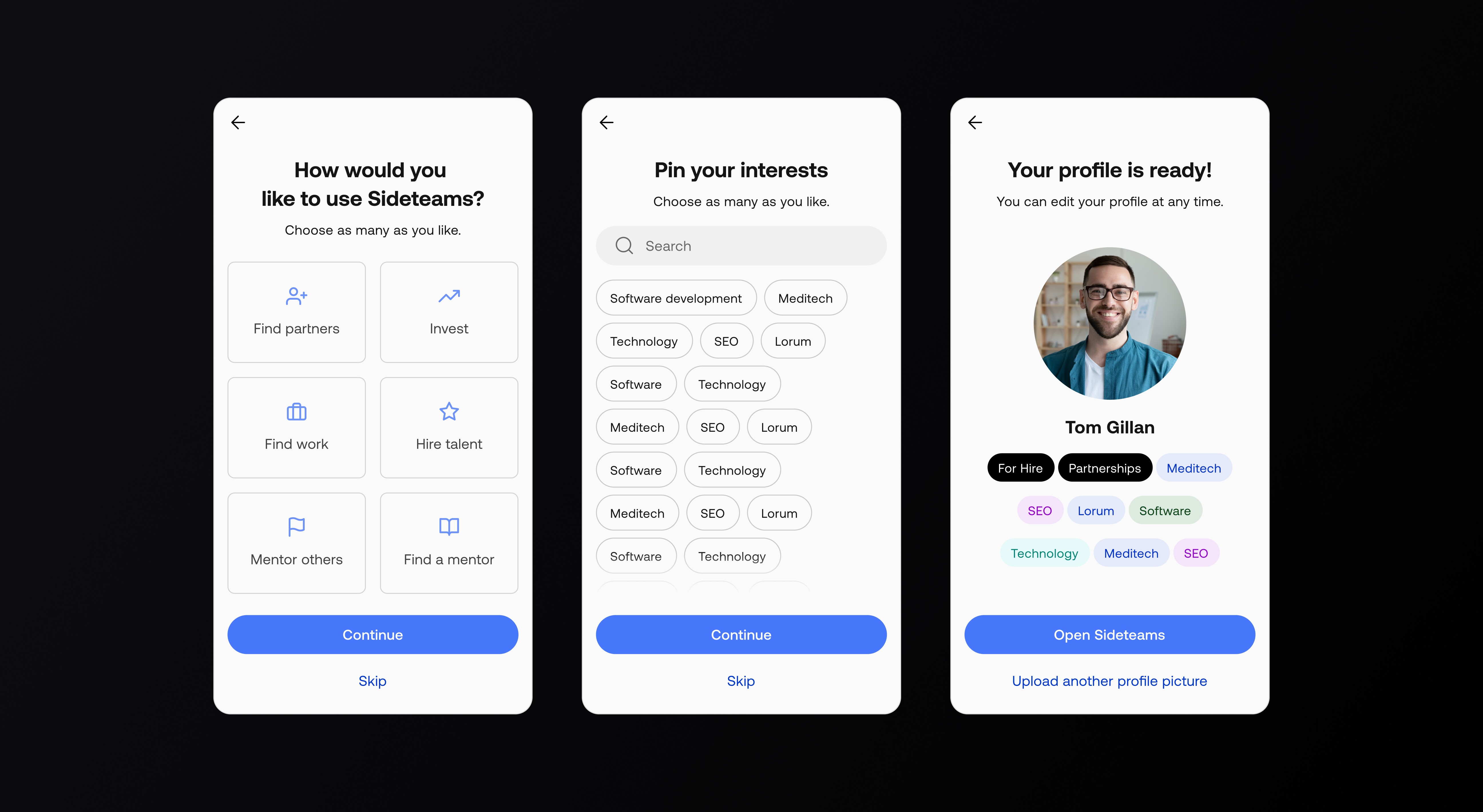 Sideteams connects founders, operators, and investors to form teams, find roles, and share opportunities. I led UX and UI across onboarding, browse, people/teams directories, content, and profile flows—turning insights from analytics and session recordings into a simpler information architecture and a cleaner, more scannable interface.